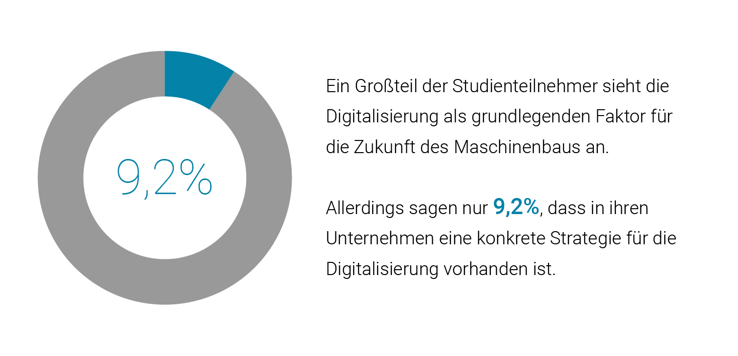 Although the majority of the study participants consider digitalisation to be a fundamental aspect of the future of mechanical engineering, only 9.2 percent stated that their company has devised a concrete digitalisation strategy. The main reason for this lies in the vast differences between mechanical engineering companies. Each business is made up of such a unique combination of different factors (sector, company size, market conditions) that there isn’t one standard approach to digital transformation. The most important task therefore is to gain an interdisciplinary perspective – every field of business needs to be involved because digitalisation is not a process that applies only to certain areas. And should employees express concerns, these can be dealt with succinctly in training courses and workshops – an approach that all the respondents agreed on.