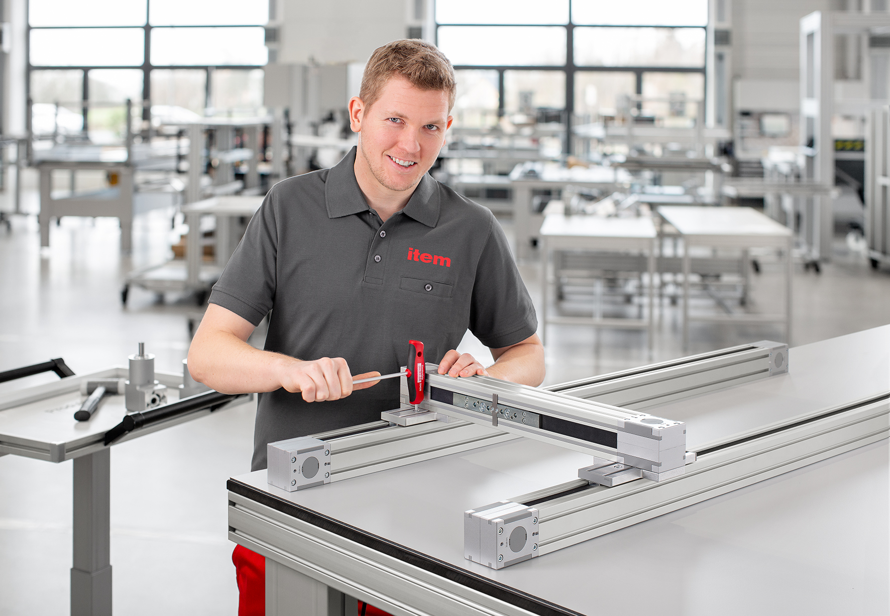 The range of Gearboxes offered by item now also includes Gearbox 60-16. Exhibiting a gear ratio of 1:16, this extremely robust solution generates a high drive torque at a medium motor speed, ensuring heavy loads can be securely moved and held in place. One benefit of this is that no powerful motors are required to implement high-speed lifting movements. Gearbox 60-16 connects a motor to a drive set in an axial (AP) or bevel (WP) arrangement. It can be combined with other components that have a 60 mm-wide housing in a plug and play arrangement. This low-noise and compact planetary gearbox is available in the gear ratios 1:3, 1:5, 1:7 and 1:16, and does not require any maintenance.